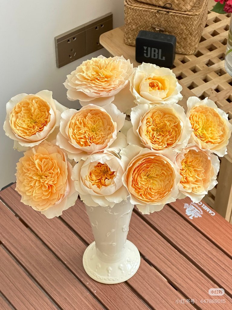 Effie is a cut rose variety bred by David Austin in the United Kingdom. Its blooms are cup-shaped, featuring a bright yellow center surrounded by soft white outer petals. The flowers carry a moderate tea fragrance and have a vase life of approximately 8 days, making them well suited for use as cut flowers.